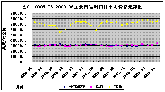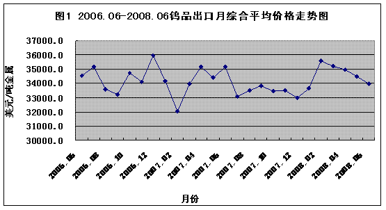 出口鎢品綜合平均價(jià)格34509.21美元/噸金屬,同比下跌4.24%。與去年相反,今年年初鎢品出口貿(mào)易開市價(jià)格略有走高,1月份綜合平均價(jià)格33638.9美元/噸,比上期(2007年12月)上漲2.03%,2月份達(dá)到35580.9美元/噸,為上半年的高位,3-6月份呈小幅下滑走勢,出口價(jià)格總體趨于平穩(wěn)運(yùn)行。見圖1
