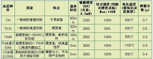 目前,采用納米涂層技術(shù)開發(fā)出來的鍍膜有兩種,一種是以TiSiN為主要成分的“TH涂層”,一種是以CrSiN為主要成分的“CS涂層”。前者主要用于高硬度材料的加工,后者主要用于低硬度及軟質(zhì)材料的加工,這兩種涂層刀具均已于2002年初投放市場。表1所示為PVD涂層各種鍍膜的性能。