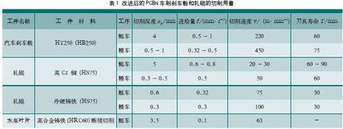 。2)近年來,PCBN刀具的應(yīng)用逐漸增多,最明顯的是進(jìn)入冶金工業(yè)中軋輥和汽車工業(yè)中汽車剎車車轂以及鉆探工程的泥漿泵的加工。與原用的硬質(zhì)合金和陶瓷刀具相比,PCBN刀具取得了令人滿意的結(jié)果,其切削用量如表1所示。從表中可知,改進(jìn)后的切削深度、進(jìn)給量都很大,切削速度也較高,可以獲得較高的加工效率。過去這類產(chǎn)品加工都用硬質(zhì)合金和陶瓷車刀,現(xiàn)在已被PCBN刀具代替,這是一個(gè)很大的進(jìn)步。