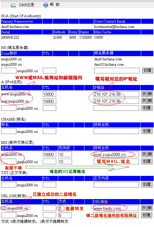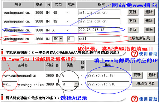 a、 郵箱指向:于主機(jī)記錄列表中增加一條,主機(jī)名填mail、類型選擇A、指向填上MAIL郵局IP |