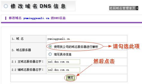 一般剛進(jìn)入修改DNS界面,域名所使用的 DNS 便是我司的 DNS (如下圖),因此,現(xiàn)在只需要選擇 "使用我公司的域名服務(wù)器進(jìn)行解析" 選項(xiàng), DNS 便自動填入新網(wǎng)互聯(lián)的 DNS 。如下圖 : |