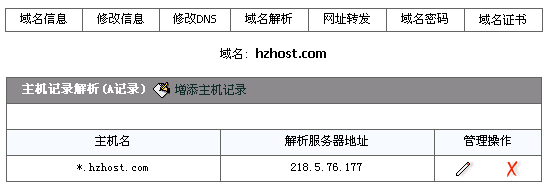 現(xiàn)以域名hzhost.com為例,把泛域名*.hzhost.com解析到IP地址218.5.76.177。