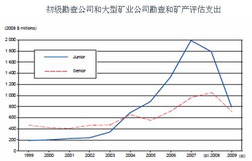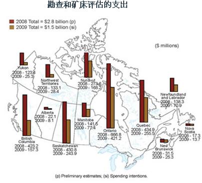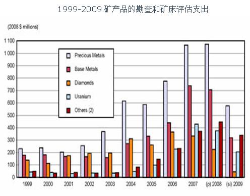 加拿大礦業(yè)勘查概況 2008年下半年,大多數(shù)礦產(chǎn)品和金屬商品價(jià)格暴跌,很大程度上是由于全球信貸和資本市場動(dòng)蕩。采礦活動(dòng)在世界各地減緩是前所未有的。在2008年底,礦產(chǎn)和金屬公司的損失是驚人的。這對(duì)2009年的預(yù)算產(chǎn)生重大影響。在2008年初調(diào)查中預(yù)計(jì)預(yù)算超過100萬美元的大約100家公司,不愿意在2009年有預(yù)算投入。此外,近30個(gè)以消費(fèi)為主的公司還宣布,2009年不打算有支出。因此,2009年整個(gè)行業(yè)試圖調(diào)整當(dāng)前的市場動(dòng)力會(huì)受到限制。比如降低成本和勘探預(yù)算通常是大幅度削減或降低主要方面之一。由于全球金融和經(jīng)濟(jì)危機(jī)持續(xù)嚴(yán)重的事態(tài),2009年初估計(jì)的勘探和礦床評(píng)價(jià)支出下降約50%,為15億美元。