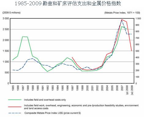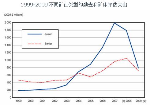 同2007年類似,2008年礦山外的勘探達(dá)到創(chuàng)紀(jì)錄的21億美元,其中約占總支出的75%。72個(gè)礦山外的評(píng)估項(xiàng)目獲得5.26億美元,占總額的19%,這構(gòu)成了6%的增長。較高的礦產(chǎn)品價(jià)格(至少到2008年中)和有保障的融資,鼓勵(lì)公司重新對(duì)已知礦床開展工作,經(jīng)過短暫重新評(píng)估項(xiàng)目之后,正在迅速邁向生產(chǎn)決策、跟蹤或收購。
