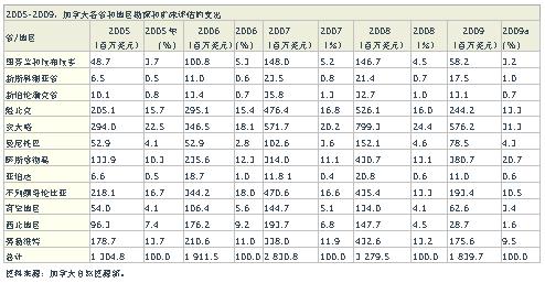 加拿大各省和地區(qū) 2008年,安大略省勘查和礦床評(píng)估開支增加(高達(dá)17%),薩斯喀徹溫。37%),馬尼托巴(增長35%)和阿爾伯塔(增長87%),其他地區(qū)都有所減少。增幅最大的是在薩斯喀徹溫省,領(lǐng)先于安大略省?傊С鲱I(lǐng)先的主要地區(qū)是安大略省,魁北克省,薩斯喀徹溫省和不列顛哥倫比亞省,它們占總勘查支出費(fèi)用的69%。在以上所有省中,目前的數(shù)據(jù)顯示2009年勘查支出費(fèi)用都是下降的。