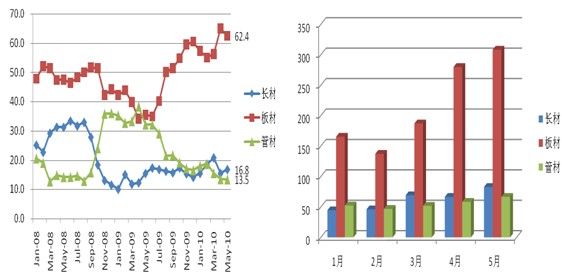 板管比變化幅度不大,由去年同期的73.8%,升為今年1-5月份的75.4%,上升了1.76個(gè)百分點(diǎn)。但板材比重迅速上升,管材大幅下降,與國際市場的貿(mào)易保護(hù)主義有直接的關(guān)系。