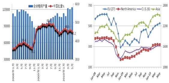 從 WSA的統(tǒng)計(jì)數(shù)字上看,今年前5個(gè)月,中國不僅占全球粗鋼產(chǎn)量的比重由上年的48.1%降為45.9%,而且從增量變化上看,中國也出現(xiàn)下降趨勢,除中國 以外的其他國家粗鋼增量占61.6%,而中國只占39.4%。歐盟27國粗鋼產(chǎn)量同比增長年45.9%,其中歐盟最大產(chǎn)鋼國—德國粗鋼產(chǎn)量同比增長了 66.7%;北美地區(qū)粗鋼產(chǎn)量同比增長了60.7%,其中美國增長了69.3%;南美增長了33.0%,其中巴西增長了56.9%;亞洲的日本增長了 52.7%;大洋洲的澳大利亞增長了87.9%。與上述國家和地區(qū)粗鋼產(chǎn)量迅猛增長形成對照的是,同期中國粗鋼產(chǎn)量只增長了23.8%,遠(yuǎn)遠(yuǎn)低于上述國家 和地區(qū),也就是說,經(jīng)受金融危機(jī)打擊的北美和歐洲市場資源供給日趨充裕,對進(jìn)口鋼材的需求有所降低。