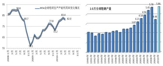 根據(jù)6月21日WSA公布的最新統(tǒng)計(jì)數(shù)字,1-5月份,全球66個(gè)國家和地區(qū)累計(jì)生產(chǎn)粗鋼5.86億噸,同比增長29.8%;5月份當(dāng)月粗 鋼產(chǎn)量1.24億噸,同比增長29.1%,粗鋼產(chǎn)能利用率82.0%,連續(xù)第四個(gè)月保持在80%以上。按此計(jì)算,2010年全球粗鋼產(chǎn)量將達(dá)到14.5億 噸水平,取代2008年成為全球粗鋼產(chǎn)量的最高峰值。