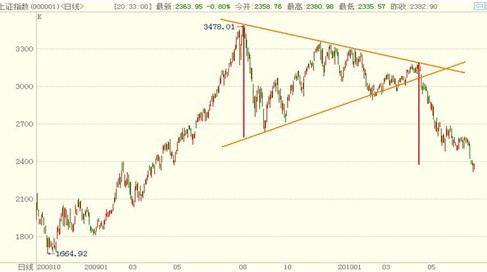 從2009年7月份至 2010年4月份,上證指數(shù)走出了一個巨大的收斂三角形,后隨著國家房地產(chǎn)調(diào)控政策的出臺,該三角形選擇向下突破。從形態(tài)學(xué)理論上來說,到目前為止上證指 數(shù)基本下跌到位。如圖所示,該三角形上下最大垂直邊距大約為700點(diǎn),而三角形突破之時上證指數(shù)在3150點(diǎn)左右。按照三角形形態(tài)論,三角形突破后,其突 破幅度應(yīng)該為三角形的垂直邊距,那么可以估算上證指數(shù)的下跌目標(biāo)為2450點(diǎn)左右。目前上證指數(shù)剛好是在2400點(diǎn)左右,可以說已經(jīng)完成了三角形的突破下 跌。前期上證指數(shù)一度在2500點(diǎn)顯示出較強(qiáng)的支撐力度,說明市場在此處有較多買盤進(jìn)入,但后來農(nóng)行IPO導(dǎo)致大盤破位下跌,這波下跌明顯帶有非理性和誘 空的味道。整體上看來,股市很可能在2400點(diǎn)下跌到位后開始出現(xiàn)較大級別的反彈。