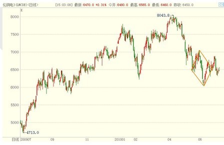 作為有色金屬期價變化的風(fēng)向標(biāo),銅價的漲跌一直受到投資者密切關(guān)注。雖然2010年上半年,銅價在高位走出了類似于M頭的形態(tài),但是近期的下跌并未直接有效的擊穿頸線位置,而是出現(xiàn)了短期底部形態(tài)特征。如圖所示,倫銅M頭的頸線在6500美元一線,前期價格雖然跌穿此價位,但迅速反抽回到該價位上方,此 后一直圍繞著6500美元上下震蕩。值得注意的是在五、六月間的震蕩過程中,銅價走出了一個明顯的菱形,該菱形的中軸剛好在6500美元一線。菱形的出現(xiàn) 說明市場在此價位分歧巨大,菱形之后期價依然處在強(qiáng)勢震蕩之中,因此,這個菱形很有可能是短期底部的特征,也就是說后期銅價會出現(xiàn)較大幅度的反彈。