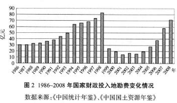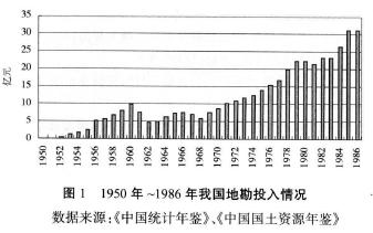 一、新中國成立以來的總地勘投入 1950~1999年地勘體制改革前,地勘投資是政府財(cái)政主導(dǎo)型經(jīng)濟(jì),一切都有計(jì)劃經(jīng)濟(jì)調(diào)控和安排。數(shù)據(jù)統(tǒng)計(jì)顯示(如圖1,圖2),1950~1986年,我國地勘投入從1950的100萬元,增長為年1986的31.4億元。改革開放使得我國經(jīng)濟(jì)得到前所未有的發(fā)展,隨之而來的是經(jīng)濟(jì)對(duì)基礎(chǔ)礦產(chǎn)資源的大量需求,礦產(chǎn)品價(jià)格逐步攀升,地勘投人也隨之增加,政府財(cái)政對(duì)地勘投資1998年增加到83.1億元。