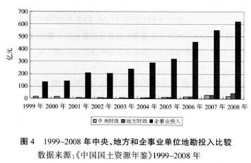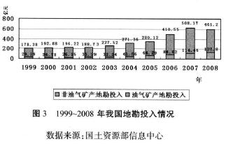 伴隨著我國經(jīng)濟(jì)從計(jì)劃經(jīng)濟(jì)向市場經(jīng)濟(jì)轉(zhuǎn)變,地勘投入不再受政府財(cái)政的主體支配,而是轉(zhuǎn)為通過市場經(jīng)濟(jì)的方式配置資源。礦業(yè)權(quán)從原來的無償使用變?yōu)橛袃斒褂谩?/SPAN>國家財(cái)政對(duì)地勘的投入從計(jì)劃經(jīng)濟(jì)時(shí)期的100%投入逐步縮減到目前大約5%的水平,取而代之的是國有企業(yè)、集體企業(yè)和民營經(jīng)濟(jì)投入。這種演變是漸進(jìn)的過程,也是國際礦業(yè)的主流趨勢,使得資金投入能夠效益最大化,減少政府的資金浪費(fèi),提高人力和物力效用,符合市場經(jīng)濟(jì)發(fā)展的規(guī)律。從 圖3中可以看出,自1999年到2008年全國地勘投入逐年增加,由1999年的207.57億元增加到2007年的622億元,2008年盡管受美國金 融海嘯的影響,但由于是發(fā)生在2008年的下半年,因此2008年礦產(chǎn)勘查投資達(dá)到歷史最高,為694.0135億元,地質(zhì)勘查總費(fèi)用為717.17億 元。