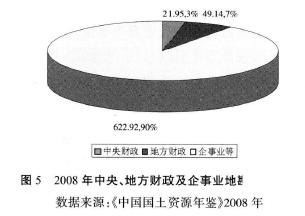 從1998年地質(zhì)勘查體制改革以來,企業(yè)已經(jīng)成為地勘投資主體,但還是以國有企事業(yè)單位投入為主。中央和地方財(cái)政對(duì)地勘的投入絕對(duì)值雖然逐年增加(如圖4所示),但是相對(duì)企事業(yè)單位投入的比例逐年下降。兩級(jí)財(cái)政對(duì)地勘的投入自1999~2008年的10年累計(jì)占總投入比例大約為4%。2008年兩級(jí)財(cái)政與企業(yè)投資比例如圖5所示,中央財(cái)政投資21.95億元,占地勘總投資的3%;地方財(cái)政投資為49.14億元,占全年地勘總投資的7%。地方財(cái)政投資是中央財(cái)政投資的2倍多。