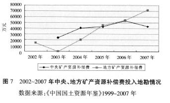 圖5和圖6反映了中央和地方財(cái)政近年來對(duì)地勘投入的變化情況。可以看出,隨著近年來礦產(chǎn)品價(jià)格持續(xù)升溫,地方財(cái)政對(duì)地勘投入持續(xù)增加,2007年達(dá)到歷史高點(diǎn)。其中地方礦產(chǎn)資源補(bǔ)償費(fèi)從2003年幾乎沒有投入變化到2007年超過7億元。圖7顯示的是2002~2007年中央、地方礦產(chǎn)資源補(bǔ)償費(fèi)投入地勘的情況,從圖中可以看出,2003年到2006年中央財(cái)政收入的礦產(chǎn)資源補(bǔ)償費(fèi)投入地勘呈增長趨勢,但2007年有所下降。地方礦產(chǎn)資源補(bǔ)償費(fèi)2002年有所投入,但在2003年幾乎沒有投入,此后一直到2007年逐年快速增加。這是由于在這一輪礦業(yè)高潮的周期中國際礦產(chǎn)品價(jià)格快速攀升,地方政府在利益驅(qū)動(dòng)下加大了政府財(cái)政對(duì)地勘的投入。