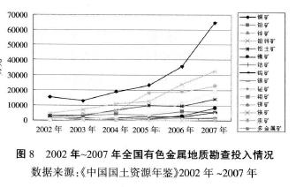 2002~2007年是國際礦業(yè)的一輪高潮期,在此期間一些主要金屬的地勘投入都呈增長趨勢,特別是我國銅、鉛鋅、鑰、鎳等地勘投入都有所增長。圖8顯示了這一輪礦業(yè)高潮期間全國有色金屬按礦種投入的勘查資金情況。其中投入最多的是銅礦,其次為鉛鋅礦,再次是多金屬、鑰礦、鋁土礦、鎳礦、鎢礦、錫礦等。由于我國銅資源緊缺加劇,因此,近年來對(duì)銅礦的勘查投入很大,投資遠(yuǎn)多于其他金屬礦種。