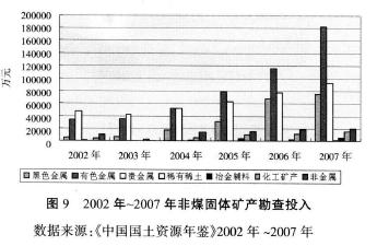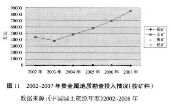 從圖9和圖10可以看出,2002~2007年間,我國非煤固體礦產(chǎn)勘查投資如按行業(yè)來分,對(duì)有色金屬的勘查投資最多,其次是貴金屬,再次是黑色金屬,即鐵礦石、鉻鐵礦等。對(duì)有色金屬的開采主要集中在銅礦種上;對(duì)貴金屬的勘查投資主要集中在黃金上;黑色金屬主要是鐵礦石的勘查投入資金多,因?yàn)榻陙碇饕獛追N有色金屬和鐵礦石、黃金的市場價(jià)格漲幅巨大,刺激了對(duì)這幾類礦種的勘查投資。對(duì)稀有稀土金屬勘查投資最少,主要是因?yàn)槲覈∮邢⊥两饘偬矫鲀?chǔ)量豐富,而且國土資源部對(duì)這一具有世界市場定價(jià)權(quán)的特殊礦種實(shí)行嚴(yán)格總量控制。