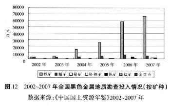 從圖11可以看出,貴金屬中,對(duì)黃金投入2007年超過8億多元,而對(duì)銀的勘查要少得多,把的勘查投入則更少。對(duì)于黑色金屬勘查投資,圖12顯示的是對(duì)鐵礦的勘查投資為主,還有少量的錳礦勘查投資,2007年對(duì)鉻礦的投入有所增加。