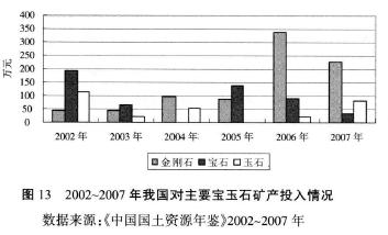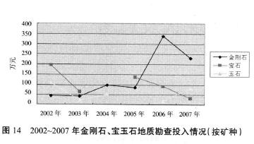 另外,在寶玉石的勘查投資中,對(duì)金剛石的勘查投資近年來總體呈增長趨勢。其中2006年投入明顯增加,達(dá)到歷史高點(diǎn);2007年較2006年投資有所下降,如圖13和圖14所示。