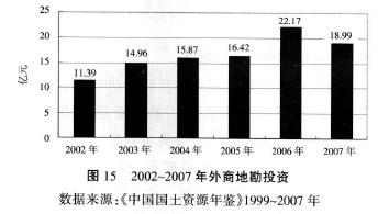 三、2002~2007年吸引外資勘查情況 外國礦業(yè)公司2002~2007年對(duì)中國的地勘投入有所變化,2003~2005年,每年投入稍有增加,但增加幅度很小,到2006年有明顯增長,而2007年較2006年有明顯下降。這可能主要是與國家有關(guān)部門出臺(tái)限制外資礦業(yè)公司開采中國低品位金礦有關(guān),如圖15所示。