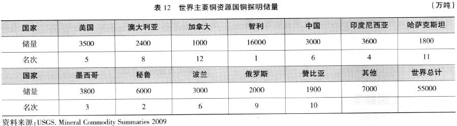 六、產(chǎn)業(yè)國際競爭力 世界上生產(chǎn)銅礦的國家很多,比較著名的銅礦生產(chǎn)國有智利、秘魯、美國、中國、印度尼西亞、俄羅斯、加拿大、贊比亞、波蘭、哈薩克斯坦、墨西哥、伊朗等。與其他主要銅礦生產(chǎn)國相比,澳大利亞銅礦產(chǎn)業(yè)的國際競爭力雖不占明顯優(yōu)勢(shì),但也絕不處于劣勢(shì),可在以下5個(gè)方面進(jìn)行大致比較。 1.資源儲(chǔ)量 關(guān)于澳大利亞的銅資源儲(chǔ)量,美國地質(zhì)調(diào)查局2009年數(shù)據(jù)與澳大利亞地球科學(xué)局2009數(shù)據(jù)有顯著不同,主要是分類標(biāo)準(zhǔn)不同造成的。但即使是按美國地質(zhì)調(diào)查局的數(shù)據(jù)和統(tǒng)計(jì)標(biāo)準(zhǔn),2008年澳大利亞探明銅資源儲(chǔ)量也為2400萬噸,居世界第八位(見表12)。又據(jù)美國地質(zhì)調(diào)查局資料,如以EDR來進(jìn)行評(píng)估,則澳大利亞銅儲(chǔ)量占世界銅總儲(chǔ)量的12%,僅位于智利(占世界總儲(chǔ)量的30%)之后。