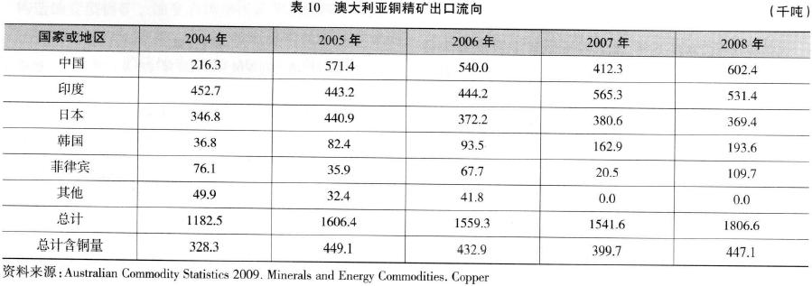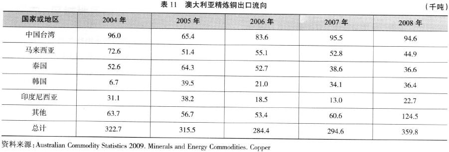 1.出口 澳大利亞國內(nèi)消費(fèi)的銅僅占其銅產(chǎn)量的三分之一左右,其余可用于出口創(chuàng)匯。10年來澳大利亞的銅出口量見表8。由表8可見,總體上,澳大利亞銅出口量呈現(xiàn)了不斷增長的態(tài)勢(shì)。其中,礦山產(chǎn)品(銅精礦)和精煉產(chǎn)品(精煉銅)的各自出口量見表9。10年中,澳大利亞銅精礦出口量增長了47.5%,精煉銅出口量也增長了40.6%。 2.主要出口市場 進(jìn)人21世紀(jì)以來,澳大利亞銅精礦的主要出口市場有中國、印度、日本、韓國、菲律賓等。精煉銅的出口市場主要有中國臺(tái)灣、馬來西亞、歐盟、泰國、韓國、印度尼西亞等國家和地區(qū)。近5年澳大利亞銅精礦和精煉銅的出口流向分別如表10和表11所示。由表10可見,2005、2006和2008年,中國是澳大利亞銅精礦第一出口目的地。而由表11可見,中國臺(tái)灣始終是澳大利亞精煉銅最大的出口目的地。