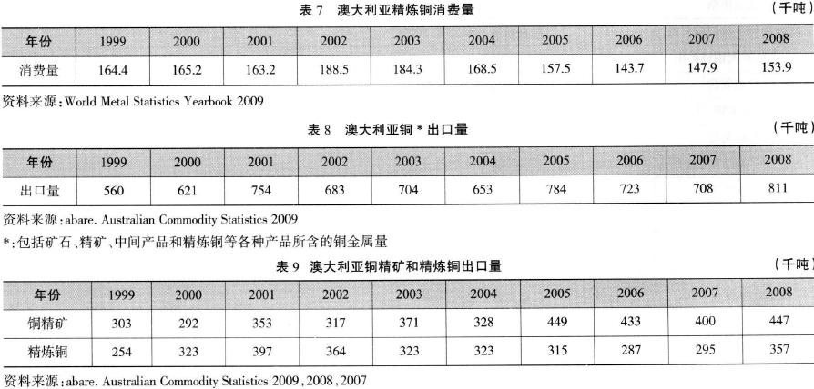 五、消費(fèi)、貿(mào)易和主要出口市場 10年來,澳大利亞的精煉銅消費(fèi)見表7。由表7可見,澳大利亞每年精煉銅消費(fèi)量大體保持穩(wěn)定,變化在188.5千噸-143.7千噸之間,10年中平均年消費(fèi)量為163.7千噸。總體上看,澳大利亞近5年(2004-2008)精煉銅消費(fèi)量比前5年(1999-2003)明顯走低。