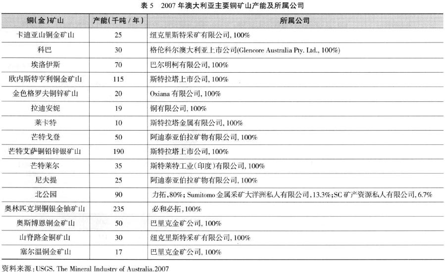 四、主要經(jīng)營公司、主要生產(chǎn)礦山與冶煉廠 近些年,在澳大利亞開展銅礦經(jīng)營的公司主要有 斯特拉塔(Xstrata plc)、巴爾明柯(Barminco Ply Ltd.)、阿迪泰亞伯拉礦產(chǎn)有限公司(Aditya Birla Minerals Ltd.)、必和必拓(BHP Billiton Ltd.)、力拓(Rio Tinto Ltd.)、斯特萊特工業(yè)(印度)有限公司(Sterlite Industries( India) Ltd.)、巴里克金礦公司(Barrick Co1d Corp)、紐克里斯特采礦有限公司(Newcrest Mining Ltd)等,這些公司構(gòu)成了澳大利亞銅礦業(yè)的基礎(chǔ)和中堅(jiān)力量。 澳大利亞主要銅生產(chǎn)礦山有奧林匹克壩(Olympic Dam)、卡迪亞山(Cadia Hill)、科巴(Cobar)、埃洛伊斯(Eloise)、歐內(nèi)斯特亨利(Ernest Henry)、金色格羅夫(Golden Grove)、拉迪安妮(Lady Annie)、萊卡特(Leich-hardt)、芒特戈登(Mount Gordon)、芒特艾薩(Mount Isa)、芒特萊爾(Mount Lyell)、尼夫提(Nifty)、北公園(Northparkes)、奧斯博恩(Osborne)、山脊路(Ridgeway)、塞爾溫 (Selwyn)等。各主要礦山產(chǎn)能和所屬公司見表5。