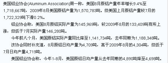 美國8月原鋁產(chǎn)量年率增長9.4%至1,718,667噸--鋁業(yè)協(xié)會