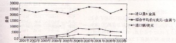 圖3 2001-2010年上半年進口鎢品量、價格、進口額