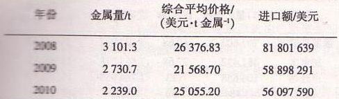 2010年上半年,中國進口鎢品2 239 t(金屬量,含鎢精礦,下同),同比下降18.01%,比2008年同 期進口量下降27.8 1%,其中進口鎢精礦1739 t,同比下降28.12%,比2008年同期下降30.23%;進口額5 610萬美元,同比下降4.76%,比2008年同期下降3142%。