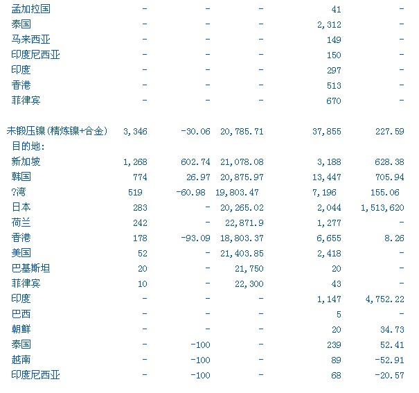 路透北京9月21日電---以下是中國(guó)海關(guān)公?的8月精煉鉛、鋅、錫和鎳等金屬進(jìn)出口分項(xiàng)數(shù)據(jù)一 覽表(單位均為噸)