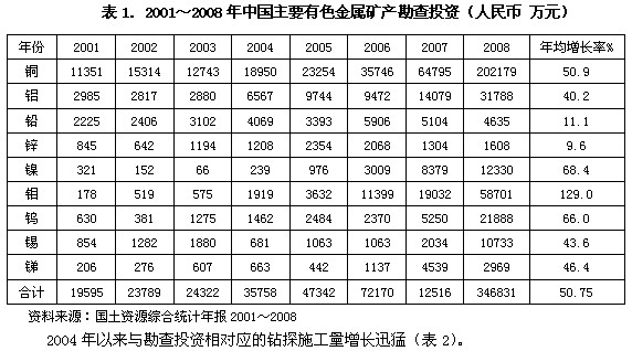 一、主要有色金屬礦產(chǎn)資源的勘查進(jìn)展 地質(zhì)大調(diào)查部署金屬礦產(chǎn)找礦勘查工作的重點(diǎn)區(qū)域:西南三江、雅魯藏布江、昆侖山、天山、秦嶺、祁連山、大興安嶺、南嶺等重要城礦區(qū)帶。在西部地區(qū)以尋找新的大型、超大型礦床為目標(biāo);在中東部地區(qū)開展隱伏礦床與深部礦床的找礦工作;并輔以老礦區(qū)深部和周邊勘查增加資源儲(chǔ)量的方針。 。ㄒ唬┛辈橥度爰般@探施工 中國(guó)礦產(chǎn)資源勘查投資的來源包括:中央財(cái)政撥款(含資源補(bǔ)償費(fèi))、地方財(cái)政撥款(含資源補(bǔ)償費(fèi)),企事業(yè)單位(含外資企業(yè))。 2008年9種主要有色金屬的勘查投資合計(jì)34.68億元,它們占勘查投資合計(jì)的比例分別為:銅58.29%、鋁土礦9.17%、鉛鋅1.8%、鎳3.56%、鉬16.92%、鎢6.31%、錫3.09%、銻0.86%。