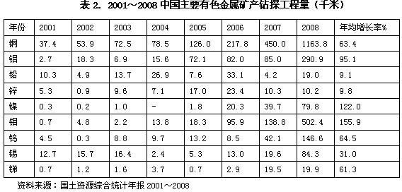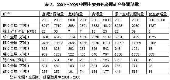 表1的統(tǒng)計(jì)數(shù)據(jù)表明,從2004年開始9種主要有色金屬礦產(chǎn)的勘查投資高速增長(zhǎng)。2001至2008年的年均增長(zhǎng)率,除鉛鋅外,都大大超過我國(guó)的GDP年均增長(zhǎng)率。 。ǘ┵Y源儲(chǔ)量 2001~2008年,伴隨勘查投入增加,9種主要有色金屬的查明資源儲(chǔ)量相應(yīng)增加(表3),它們的年均增長(zhǎng)率分別為:銅2.76%、鋁土礦3.01%,鉛3.5%、鋅2.38%、鎳1.1%、鉬3.75%、鎢0.37%、錫0.8%、銻2.22%。 值得注意的是2001~2008年期間,銅、鎳、鎢、錫、銻5種礦產(chǎn)的查明資源儲(chǔ)量中基礎(chǔ)儲(chǔ)量的增速低于礦山開發(fā)消耗的增速,基礎(chǔ)儲(chǔ)量呈下降狀態(tài)。