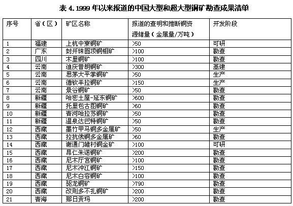 二、主要有色金屬礦產(chǎn)資源的重要勘查成果及開發(fā)前景 。ㄒ唬┿~ 在9種主要有色金屬礦產(chǎn)中,銅的勘查投入最大,所獲成果頗豐。近年來新發(fā)現(xiàn)的大型超大型礦產(chǎn)地21處,詳見表3(銅金屬量大于50萬噸)。據(jù)近年來我國(guó)銅資源的勘查投入、施工和勘查成果,預(yù)計(jì)2010~2015年我國(guó)查明銅資源儲(chǔ)量仍將大幅度增加。西部地區(qū)是資源儲(chǔ)量的主要增加區(qū),西藏的銅查明資源儲(chǔ)量有望達(dá)到4000萬噸,將成為中國(guó)資源儲(chǔ)量最多的省(區(qū))。新疆的資源儲(chǔ)量也有望超過江西和云南兩省,跨入資源儲(chǔ)量超千萬噸的。▍^(qū))行列。 后續(xù)商業(yè)性勘查資金的投入多寡將決定資源量升級(jí)為基礎(chǔ)儲(chǔ)量的數(shù)量,也將確定這些礦區(qū)的開發(fā)時(shí)段。預(yù)計(jì)2020年前西藏和新疆各有2-3處礦區(qū)進(jìn)入開發(fā)階段,如謝通門、驅(qū)龍、哈拉蘇、達(dá)巴特等。西部地區(qū)銅資源開發(fā)利用應(yīng)采取現(xiàn)代化和規(guī)模化的方式。西藏地區(qū)生態(tài)環(huán)境脆弱、能源匱乏、礦產(chǎn)開發(fā)最好以采選業(yè)為主,盡量避免發(fā)展冶煉業(yè)。