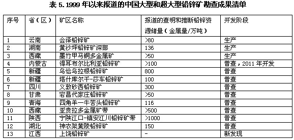 。ǘ╀X土礦 根據(jù)我國(guó)鋁土礦成礦的地質(zhì)條件,勘查增儲(chǔ)的工作主要部署在河南、山西、廣西和貴州的老礦區(qū)周邊。近年來我國(guó)鋁土礦的資源儲(chǔ)量新增較多的主要省區(qū)為:河南3.22億噸、廣西1.61億噸,貴州省1.13億噸、山西0.53億噸。其中廣西、河南、山西新增資源儲(chǔ)量開發(fā)條件較好,可作為后備生產(chǎn)資源基地。 我國(guó)鋁土礦礦石質(zhì)量不佳,導(dǎo)致了國(guó)內(nèi)氧化鋁生產(chǎn)成本高于國(guó)外產(chǎn)品的水平。從目前我國(guó)氧化鋁生產(chǎn)能力占全球的份額看,完全可以抑制國(guó)際市場(chǎng)氧化鋁價(jià)格的大幅波動(dòng)。因此國(guó)內(nèi)鋁生產(chǎn)企業(yè)應(yīng)加大對(duì)外合作的力度,盡量多利用周邊國(guó)家的優(yōu)質(zhì)鋁土礦資源生産氧化鋁,降低產(chǎn)品生產(chǎn)成本,提高企業(yè)經(jīng)濟(jì)效益,增強(qiáng)企業(yè)產(chǎn)品的國(guó)際競(jìng)爭(zhēng)力。 。ㄈ┿U、鋅 近年來,盡管鉛鋅勘查投入的資金額度不及其它主要有色金屬礦產(chǎn),但亦獲得豐碩成果。據(jù)不完全統(tǒng)計(jì),表5中的13處新發(fā)現(xiàn)礦區(qū)的資源儲(chǔ)量超過1600萬噸。另外,未來幾年內(nèi)新疆祁漫塔格找礦遠(yuǎn)景區(qū)和西藏地區(qū)仍可增加新查明的資源儲(chǔ)量。 云南會(huì)澤、湖南黃沙坪、西藏墨竹屬于生產(chǎn)礦區(qū),新增資源儲(chǔ)量將延長(zhǎng)礦山的壽命。預(yù)計(jì)2020年前,新疆烏恰烏拉根和內(nèi)蒙古得耳布爾比利亞礦區(qū)有望開發(fā)利用。