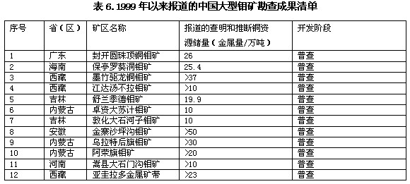 。ㄋ模╂ 雖然鎳礦勘查投入不斷增加,但受到成礦條件的限制,在我國(guó)尋找新的大型鎳礦已成為當(dāng)前有色金屬找礦工作的瓶頸項(xiàng)目。未來國(guó)內(nèi)礦山大規(guī)模增加鎳礦供應(yīng)的前景堪憂。 近期最重大的勘查成果為河南省地礦局近期在唐河縣周庵一帶發(fā)現(xiàn)一處大型銅鎳礦床。已查明資源儲(chǔ)量中,有鎳32.43萬噸、銅12萬噸。 金川集團(tuán)公司匯同國(guó)內(nèi)地質(zhì)調(diào)查單位在西北甘蒙北山地區(qū)發(fā)現(xiàn)鎳礦帶。區(qū)內(nèi)已發(fā)現(xiàn)銅鎳礦床有甘肅黑山、中坡山1號(hào)筆架山,新疆哈密等礦床。目前,金川集團(tuán)公司已在該區(qū)黑山完成了鎳銅礦床地質(zhì)詳查評(píng)價(jià),以鎳0.3%的邊界品位,圈定資源儲(chǔ)量已達(dá)大型規(guī)模。據(jù)了解,金川集團(tuán)公司首期投入資金9億元,主要用于該區(qū)黑山礦區(qū)建設(shè)開發(fā),一期日處理礦石量3000噸。 內(nèi)蒙古二連浩特附近的蘇尼特左旗,已圈定主要含礦異常區(qū),控制了數(shù)個(gè)數(shù)百米厚、五百米寬、數(shù)公里長(zhǎng)的礦化帶,并已打到厚達(dá)20米的含鎳礦層(含鎳0.2—0.3%)。礦區(qū)位于華北板塊與俄羅斯板塊縫合帶上,有大面積的超基性巖體,區(qū)內(nèi)已有正在生產(chǎn)的高品位銅鎳礦(鎳品位5—13%,銅3—5%),極有可能發(fā)現(xiàn)新的大型銅鎳礦床。 新疆哈密近地表處發(fā)現(xiàn)與純橄欖巖有關(guān)的鎳礦體。新疆喀拉通克和吉林紅旗嶺深部及周邊找礦也有斬獲。 2008年全國(guó)新發(fā)現(xiàn)鎳礦產(chǎn)地3處。它們分別是:內(nèi)蒙古鄂倫春自治旗嘎仙鎳礦,推斷的資源量10.32萬噸;新疆若羌縣坡一鎳礦,預(yù)測(cè)的資源量6.69萬噸;新疆哈密市天宇銅鎳礦,推斷的資源量1.13萬噸,控制的資源量1.44萬噸。 (五)鉬 近年來鉬礦勘查成果令人欣慰,資源儲(chǔ)量的增加在有色金屬的小礦種中位居首位。據(jù)不完全統(tǒng)計(jì),表6中12處新發(fā)現(xiàn)礦區(qū)的資源儲(chǔ)量超過270萬噸。對(duì)于未來開發(fā)來說,后備資源充裕。目前我國(guó)鉬礦產(chǎn)量過剩,這些大型新礦區(qū)的開發(fā)利用將受到市場(chǎng)需求的限制,但對(duì)于銅礦中的伴生鉬資源來說,可能會(huì)隨銅礦的開發(fā)作為副礦產(chǎn)回收。