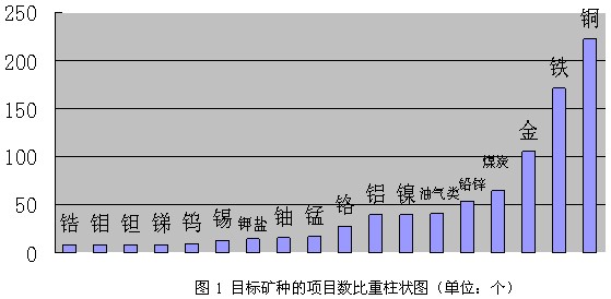 在933例項(xiàng)目中,從項(xiàng)目數(shù)量上來看,可分為四個(gè)等級(jí)。第一等級(jí)是企業(yè)境外投資項(xiàng)目,數(shù)量位列前三位的銅、鐵和黃金(其中勘查、開采項(xiàng)目以項(xiàng)目 的主礦種統(tǒng)計(jì),伴生礦種未列入;并購案以目標(biāo)公司的主營礦種統(tǒng)計(jì)),項(xiàng)目數(shù)量分別都有上百例,遠(yuǎn)遠(yuǎn)高出其它礦種。其次是鉛鋅礦、鎳礦、鋁土礦、鉻鐵礦以及 石油、天然氣和煤炭等能源礦產(chǎn),投資項(xiàng)目數(shù)量分別在50例左右。第三等級(jí)是錳、鈾、鉀鹽、錫、鎢、銻、鉭、鉬、鋯礦,項(xiàng)目數(shù)量分別在十幾例左右。其它礦種 為鉑、鈀、鈷、鈦、寶石、螢石、大理石、石英、水晶、石膏、石墨等,項(xiàng)目數(shù)量都不多(圖1,圖2)。