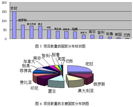 我們將勘查、開采項(xiàng)目以項(xiàng)目的實(shí)際勘查開采地點(diǎn)進(jìn)行統(tǒng)計(jì);并購等間接投資以目標(biāo)礦業(yè)企業(yè)的所屬國進(jìn)行統(tǒng)計(jì)。若該公司在兩個(gè)以上國家設(shè)有總部,則 按該公司的主營礦種總部所在地進(jìn)行統(tǒng)計(jì)。從項(xiàng)目數(shù)量上看,我國礦業(yè)企業(yè)境外投資的熱門國家是東南亞的老撾、印尼、菲律賓;亞洲的俄羅斯、蒙古;澳洲的澳大 利亞;非洲的贊比亞、剛果。具體來說,所有對(duì)象國按項(xiàng)目數(shù)量等級(jí)依次可分為五個(gè)等級(jí)。我國礦業(yè)企業(yè)境外投資項(xiàng)目最多的國家是老撾,項(xiàng)目數(shù)量超過150例。 其次是澳大利亞、俄羅斯和蒙古,項(xiàng)目數(shù)量均超過70例。第三個(gè)等級(jí)是印尼、菲律賓、贊比亞、剛果,項(xiàng)目數(shù)量在50例左右。第四個(gè)等級(jí)是加拿大、南非、津巴 布韋、埃塞俄比亞、智利、秘魯、吉爾吉斯斯坦、哈薩克斯坦、緬甸、朝鮮、柬埔寨、越南,項(xiàng)目數(shù)量分別在10—20例之間。最后一檔是美國、巴西、玻利維 亞、阿根廷、墨西哥、馬達(dá)加斯加、阿爾及利亞、蘇丹、加蓬、巴布亞新幾內(nèi)亞、博茨瓦納、尼日爾、安哥拉、伊朗、巴基斯坦、阿富汗、泰國等國家,投資項(xiàng)目數(shù) 量均在10例以下(圖5,圖6)。