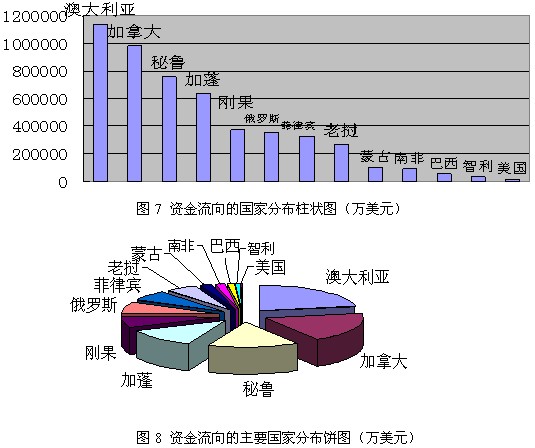 勘查、開采項(xiàng)目以項(xiàng)目的實(shí)際勘查開采地點(diǎn)進(jìn)行統(tǒng)計(jì);并購等間接投資以目標(biāo)礦業(yè)企業(yè)的所屬國進(jìn)行統(tǒng)計(jì)。若該公司在兩個(gè)以上國家設(shè)有總部,則按該公 司的主營礦種總部所在地進(jìn)行統(tǒng)計(jì)。如力拓在澳大利亞和英國都有總部,因其公司總資產(chǎn)89%集中在澳大利亞和北美且控股澳大利亞第二大鐵礦石生產(chǎn)公司,主營 礦種是鐵礦,因此將并購該項(xiàng)公司的150多億資金全部計(jì)入澳大利亞(注:意向投資均未列入統(tǒng)計(jì))。