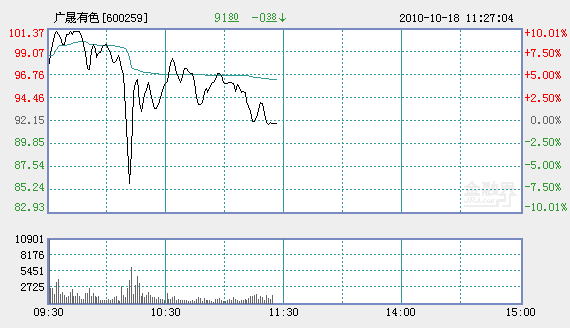 金融界網(wǎng)站18日訊 27個(gè)交易日收出10個(gè)漲停、上周漲幅高達(dá)50.77%的廣晟有色(600259)今日開盤不久便封至漲停板,但是10:00過后便直線跳水,跌幅近8%,振幅超過17%。