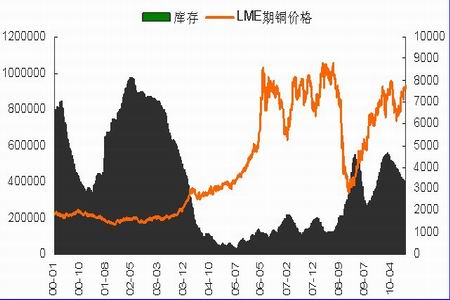 圖為LME銅庫存與價(jià)格走勢(shì)圖