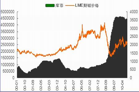 圖為LME鋁庫存與價(jià)格走勢(shì)圖