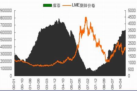 圖為LME鋅庫存與價(jià)格走勢(shì)圖