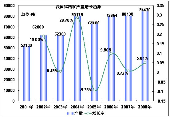 圖表 2001年¬¬~2008年我國鎢精礦產(chǎn)量增長趨勢圖