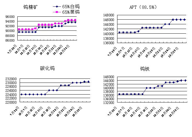 10月鎢系產(chǎn)品價(jià)格穩(wěn)定上行。 由于鎢精礦供應(yīng)缺口得不到緩解,下游產(chǎn)品價(jià)格承壓,鎢鐵、APT、碳化鎢等產(chǎn)品本月報(bào)價(jià)均有大幅上揚(yáng)。 至月底,中國黑鎢精礦已經(jīng)漲到了94,000-95,000元/噸,而9月初的時(shí)候精礦價(jià)格為84,000-85,000元/噸,年初時(shí)價(jià)格才在68,000-69,000元/噸。白鎢精礦價(jià)格比黑鎢略低,但也有明顯上漲。鎢精礦價(jià)格已創(chuàng)下08年8月以來最高。 國產(chǎn)88.50%APT報(bào)價(jià)收于145,000-147,000元/噸,比年初上漲45%。歐洲APT市場同樣堅(jiān)挺,價(jià)格頗有向300美元/噸度逼近的趨勢,且現(xiàn)貨十分有限,由于缺乏新增供應(yīng),消費(fèi)商都試圖確保之前訂單的順利執(zhí)行。 國內(nèi)市場70%鎢鐵成交價(jià)已經(jīng)上漲到了143,000-145,000元/噸。且由于精礦供應(yīng)緊張使鎢鐵產(chǎn)量減少,不少生產(chǎn)商惜售情緒頗重,不愿報(bào)價(jià)。