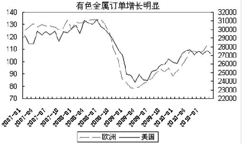 進(jìn)入十月之后,國內(nèi)銅消費(fèi)逐步轉(zhuǎn)淡,這從各加工材行業(yè)不斷下降的開工率可以看出。根據(jù)上海有色網(wǎng)的統(tǒng)計(jì)數(shù)據(jù),11月份國內(nèi)銅桿行業(yè)開工率較9月 份下滑7個(gè)百分點(diǎn),而依然處于消費(fèi)旺季的銅管行業(yè)開工率也出現(xiàn)了微幅下調(diào),預(yù)示著國內(nèi)消費(fèi)轉(zhuǎn)弱的趨勢(shì)仍在繼續(xù)。與中國消費(fèi)逐步弱化不同,美國和歐洲消費(fèi)強(qiáng) 勁程度超過市場預(yù)期,這主要是受到美國和歐洲工業(yè)生產(chǎn)恢復(fù)的帶動(dòng),有色金屬訂單的增長很好地說明了這一點(diǎn)。自2009年4月份觸底反彈之后,歐洲和美國的有色金屬訂單保持增長的態(tài)勢(shì),這種情況在近期并未發(fā)生改變。因此,美國和歐洲銅消費(fèi)依然保持在高位,這與當(dāng)前倫敦有色金屬交易所中歐洲和美國地區(qū)銅庫存的 持續(xù)流出相吻合。其中11月之后美國地區(qū)庫存下降的幅度接近5000噸。在庫存下降的同時(shí),當(dāng)前倫敦金屬交易所銅現(xiàn)貨升水已經(jīng)上升至25美元/噸附近,表 明庫存的流出并不能滿足當(dāng)?shù)叵M(fèi)的需求。作為傳統(tǒng)的銅消費(fèi)大國,美國和歐洲消費(fèi)的增長在一定程度上對(duì)沖了中國消費(fèi)下滑給市場帶來的沖擊。從而給銅價(jià)帶來一 定支撐。