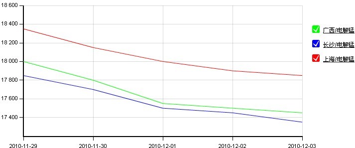 圖1:全國主要地區(qū)電解錳價格走勢圖(2010.11.29-2010.12.3)