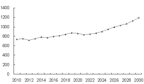 利用這種方法,結(jié)合歷史上全球的精銅 消費(fèi)情況,我們可以估算出未來20年全球的廢銅回收量:2010年前后全球的廢銅回收量在790萬噸左右,此后將會(huì)緩慢上升,至2030年將達(dá)到1200 萬噸的水平?傮w而言,未來全球的廢銅回收量將逐步上升,在全球銅原料供應(yīng)中的地位不斷提高。
