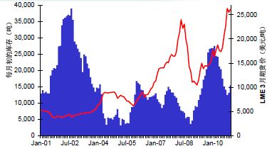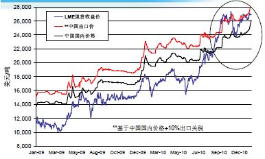 中國國內(nèi)市場2011年的表現(xiàn)將會強(qiáng)于2010年下半年。在大量出口之后,庫存已經(jīng)大幅減少,而其他原料,比如精礦和進(jìn)口原料都沒有什么增長潛力。廢料市場可能會繼續(xù)保持旺盛,但是與消費(fèi)密切關(guān)聯(lián),其增加的作用會被消費(fèi)的增加所抵消。1月中下旬國內(nèi)市場已經(jīng)開始暗流涌動,出口需求增加,加上市場對再生資源企業(yè)增值稅退稅取消的預(yù)期,在LME價格幾乎沒有變動的情況下,國內(nèi)價格快速上漲超過1萬元。2月份產(chǎn)量又會受到春節(jié)假期和天氣的影響,因此3月份以后國內(nèi)價格有可能會隨著消費(fèi)的恢復(fù)而進(jìn)一步上漲,價格倒掛的情況很快將發(fā)生轉(zhuǎn)折。