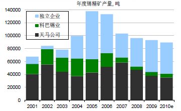 印尼作為全球錫精礦的主產(chǎn)國,2004-2005年錫精礦的產(chǎn)量曾一度接近14萬噸,但是隨著政府的管制以及其陸上資源的枯竭,2006年以后該國的產(chǎn)量一直處于持續(xù)的下降之中。2010年估計印尼的錫精礦產(chǎn)量為9萬噸左右,連續(xù)第4年下跌。根據(jù)其目前的資源情況來看,我們估計2011年印尼的精礦產(chǎn)量不會超過9萬噸,而2012年以后可能會有更大幅度的減少